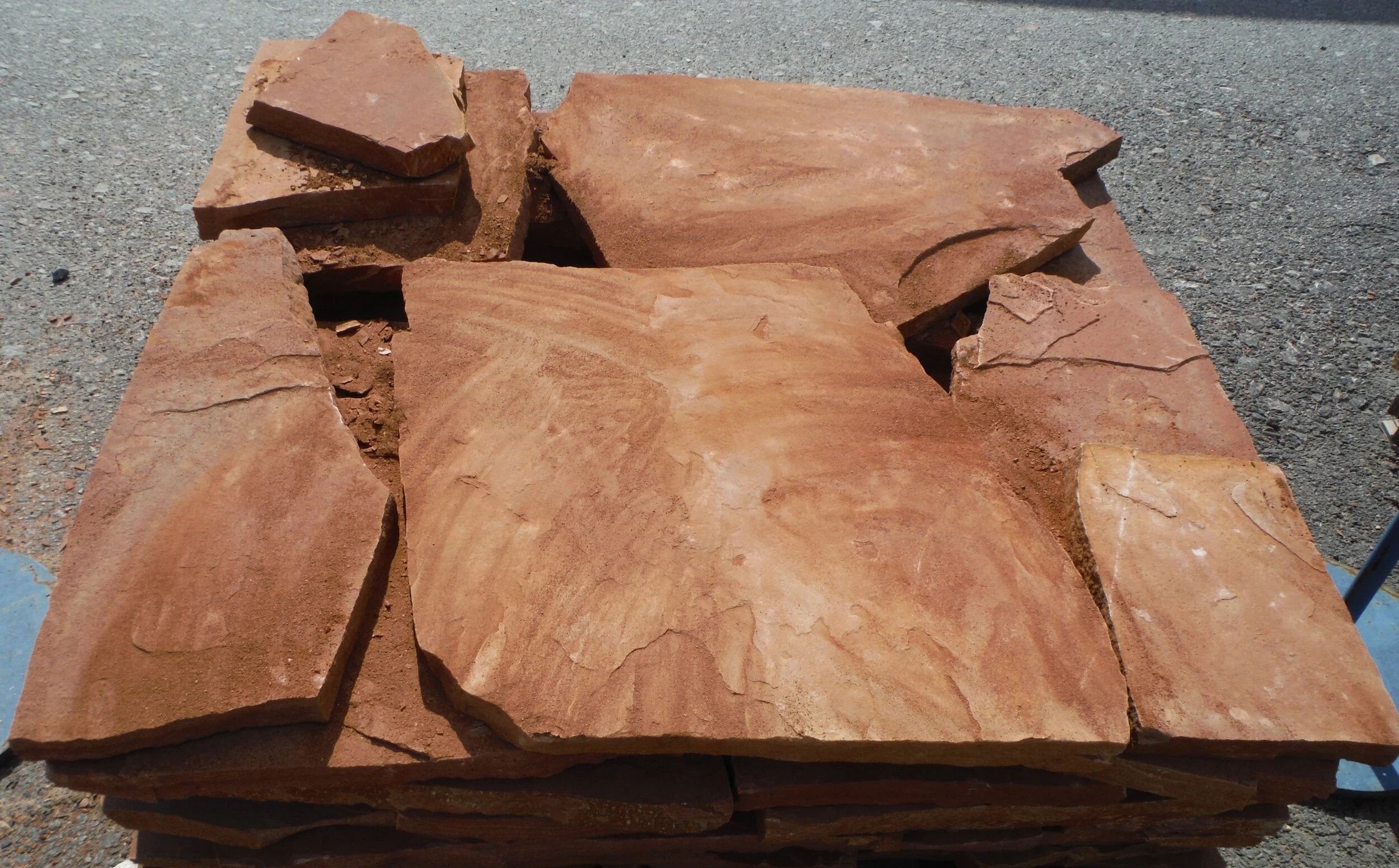 Red, brown coloration stone steppers that are 1”to 2” thick, 8” to 18” in Diameter and covers 90-100 SF per ton.